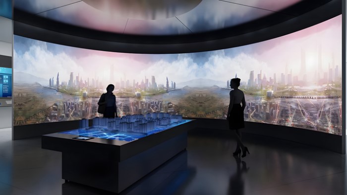 綜上所述,弧幕投影在展廳中的使用意義和優(yōu)勢(shì)非常明顯。它能夠?yàn)橛^眾帶來(lái)震撼的視覺(jué)效果,提高空間利用率和展示內(nèi)容的豐富性,同時(shí)還具有較強(qiáng)的互動(dòng)性。隨著技術(shù)的不斷進(jìn)步和應(yīng)用的不斷拓展,弧幕投影將會(huì)在未來(lái)的展廳設(shè)計(jì)中發(fā)揮更加重要的作用。
