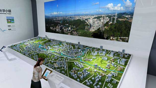 1.房地產(chǎn)展廳:在傳統(tǒng)固態(tài)沙盤(pán)的基礎(chǔ)上,加入了以動(dòng)態(tài)投影為主的各種多媒體聲光技術(shù),打破了人們對(duì)沙盤(pán)單調(diào)刻板的印象。對(duì)房地產(chǎn)展廳來(lái)說(shuō),沙盤(pán)不可或缺,而在這個(gè)信息嚴(yán)重過(guò)剩的時(shí)代,我們需要沙盤(pán)以嶄新的面貌示人,以此博得更多觀眾的眼球,從而增加潛在消費(fèi)者的數(shù)量。多媒體投影沙盤(pán)通過(guò)嚴(yán)謹(jǐn)?shù)脑O(shè)計(jì),實(shí)現(xiàn)多功能同步聯(lián)動(dòng),調(diào)用沙盤(pán)LED燈光、動(dòng)態(tài)投影視頻、大型弧幕等子設(shè)備,將樓盤(pán)最美好的一面展現(xiàn)得淋漓盡致。